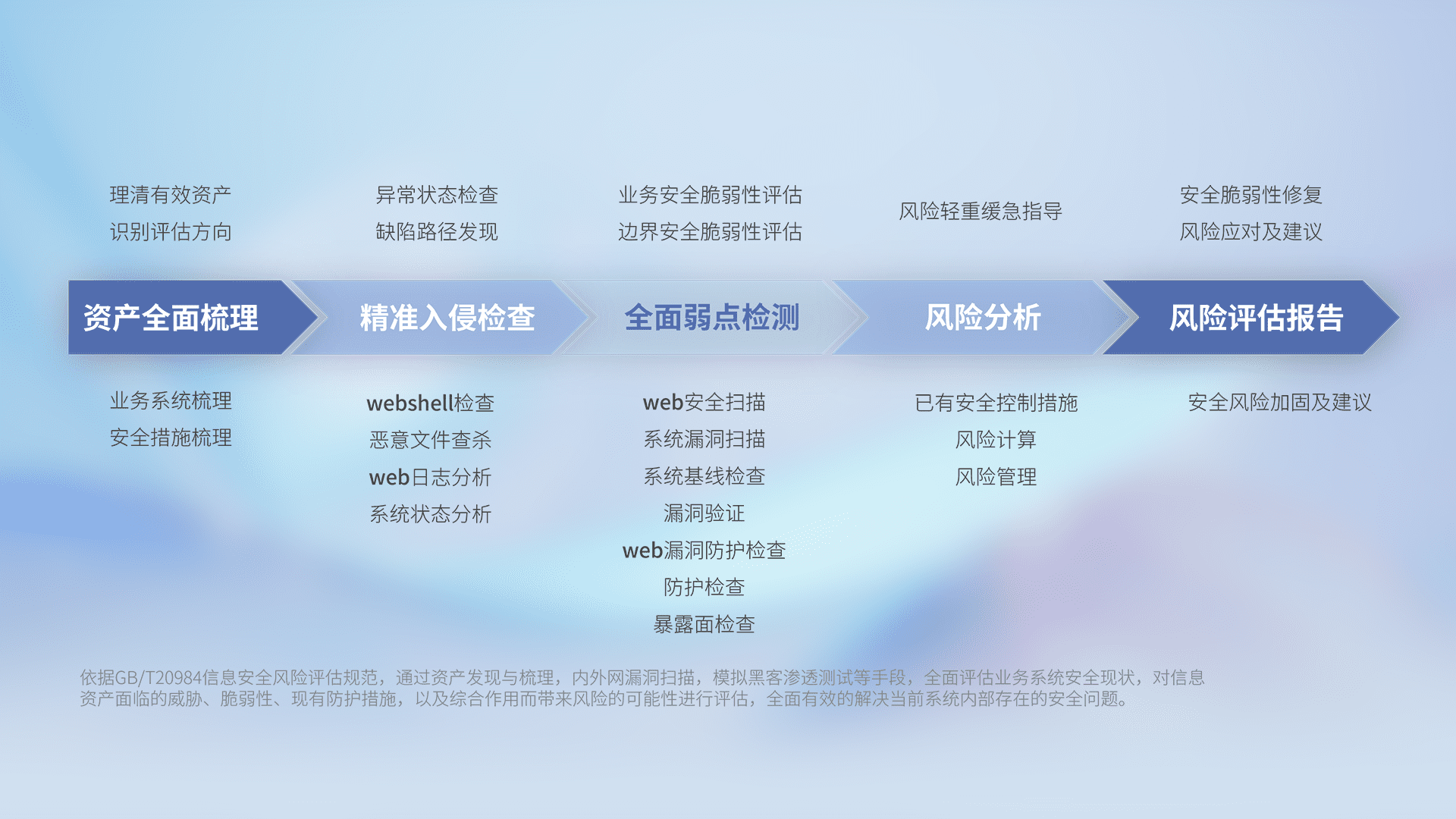 针对客户行业特性,,,,以专业的安全服务+多厂商联合解决方案提供专属的一站式安全管理服务,,,帮助客户全面感知网络空间威胁,,基于识别、、、、检测、、、分析、、防护、、、监测、、、、响应的服务理论模型,,,,从方案咨询、、集成交付、、、、评估验证、、、、优化加固、、运维运营,,,致力于为客户提供完整的闭环管理式安全服务。。。。以实战经验为客户打造高抵御风险的安全体系,,,,帮助客户发现威胁、、对抗威胁、、、、处置威胁,,,,不断积累安全对抗能力,,,持续保障数字化安全。。